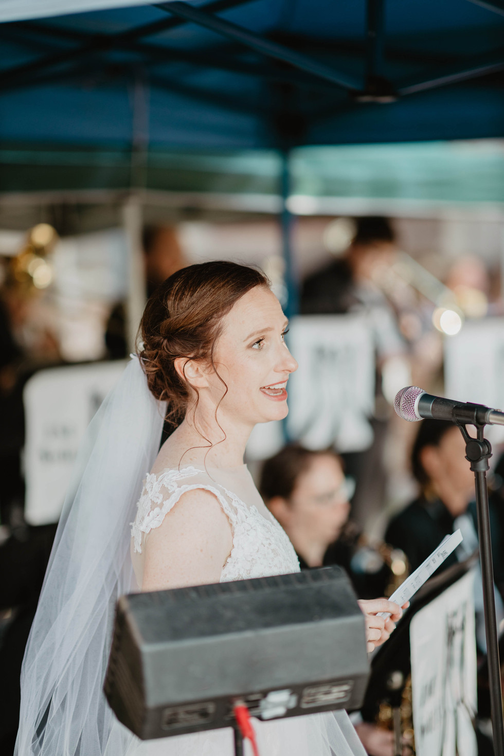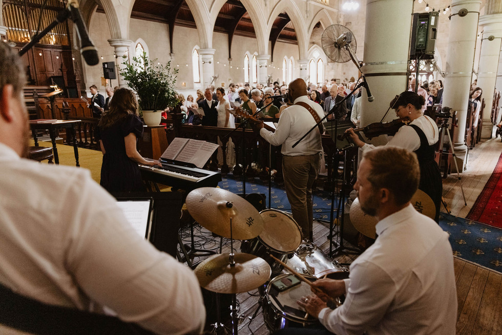Cat plays clarinet in a local Jazz band. This Jazz band was thrilled to be able to play at her wedding live, after the ceremony. They played a repertoire of Cat & James' favourites. As a surprise, Cat performed a special item for James. These lovebirds are two peas in a pod, because James also wrote an original song, for Cat, that his friend performed at their reception later that night.
