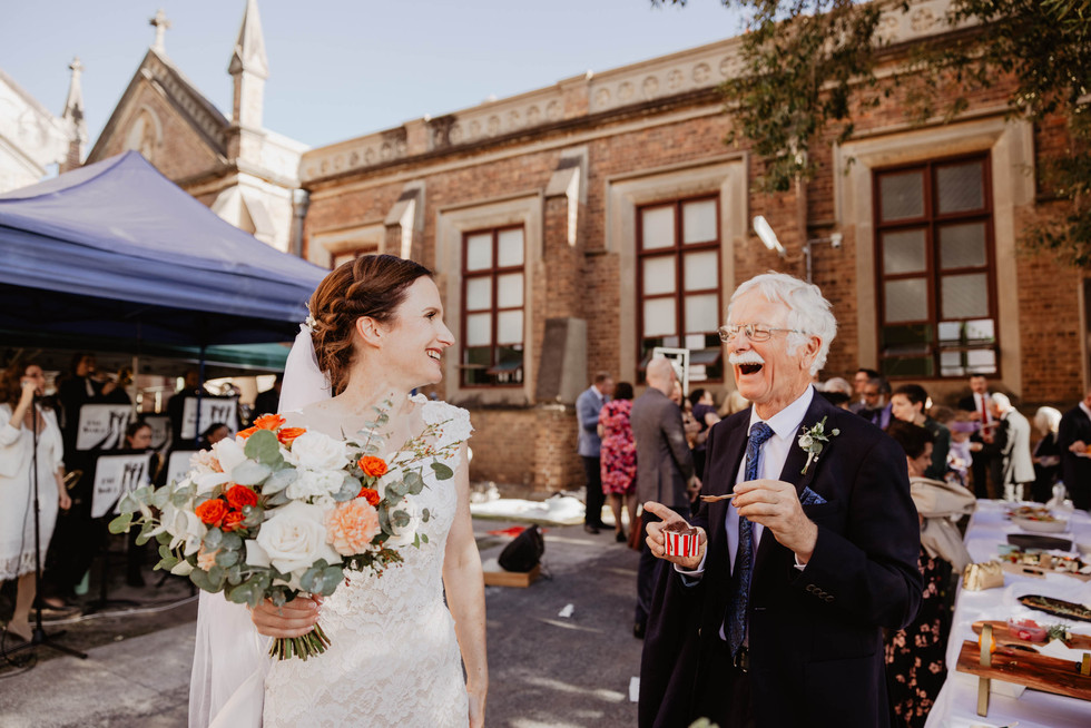 They together orchestrated the brilliant idea of using the Church's courtyard to host an intermediate after-party, between the ceremony and reception. Friends chipped in and brought along cheese boards upon cheese boards to cater for the many guests. A gelato truck, three baristas, many lawn games and afternoon tea stands all contributed towards a summertime European vibe, despite the fact of it being an Australian winter. We scheduled almost two hours here, to just enjoying the guests, atmosphere, delicious bites and countless "congratulations".